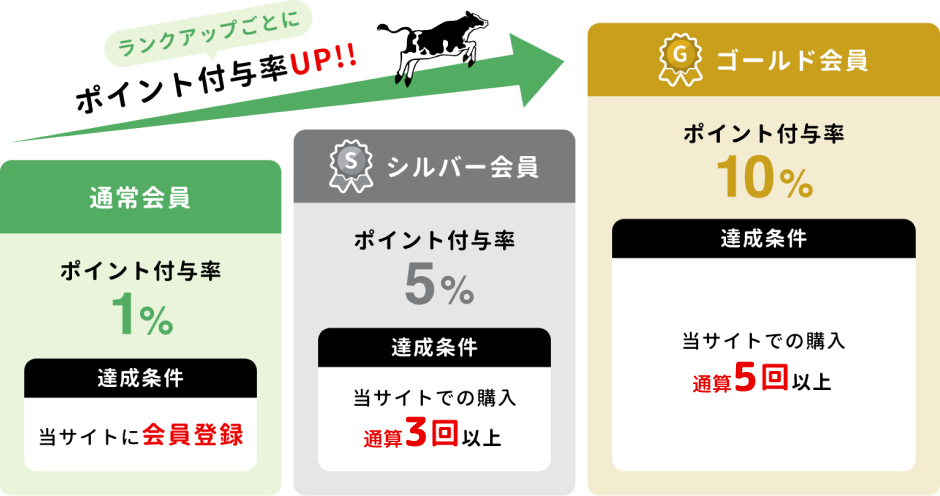 当サイトでのお買い物や愛知牧場へのご来場に応じてランクアップし、さまざまな特典をお楽しみいただけます。